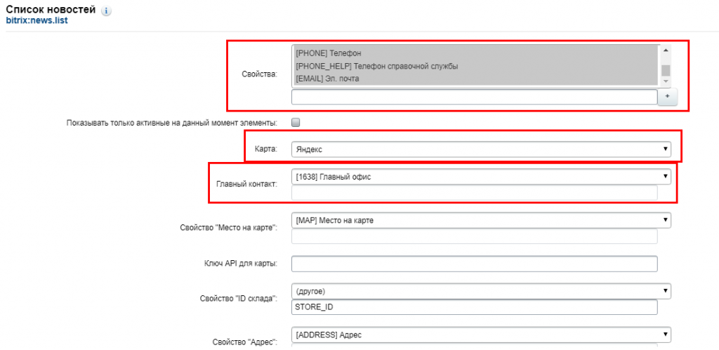 На самой странице «Контакты» перейдите в параметры комплексного компонента bitrix:news.list и укажите свойства, отвечающие за отображение параметров магазина. Кроме того, вы можете выбрать тип карты, которая будет отображаться на сайте.