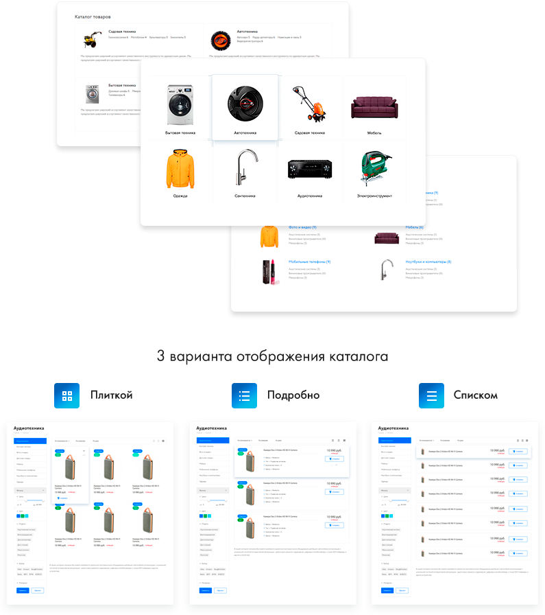 - Три варианта отображения разделов каталога: плиткой, списком с иконками или текстовым списком. Для каждой категории можно указать свой вариант отображения по умолчанию.